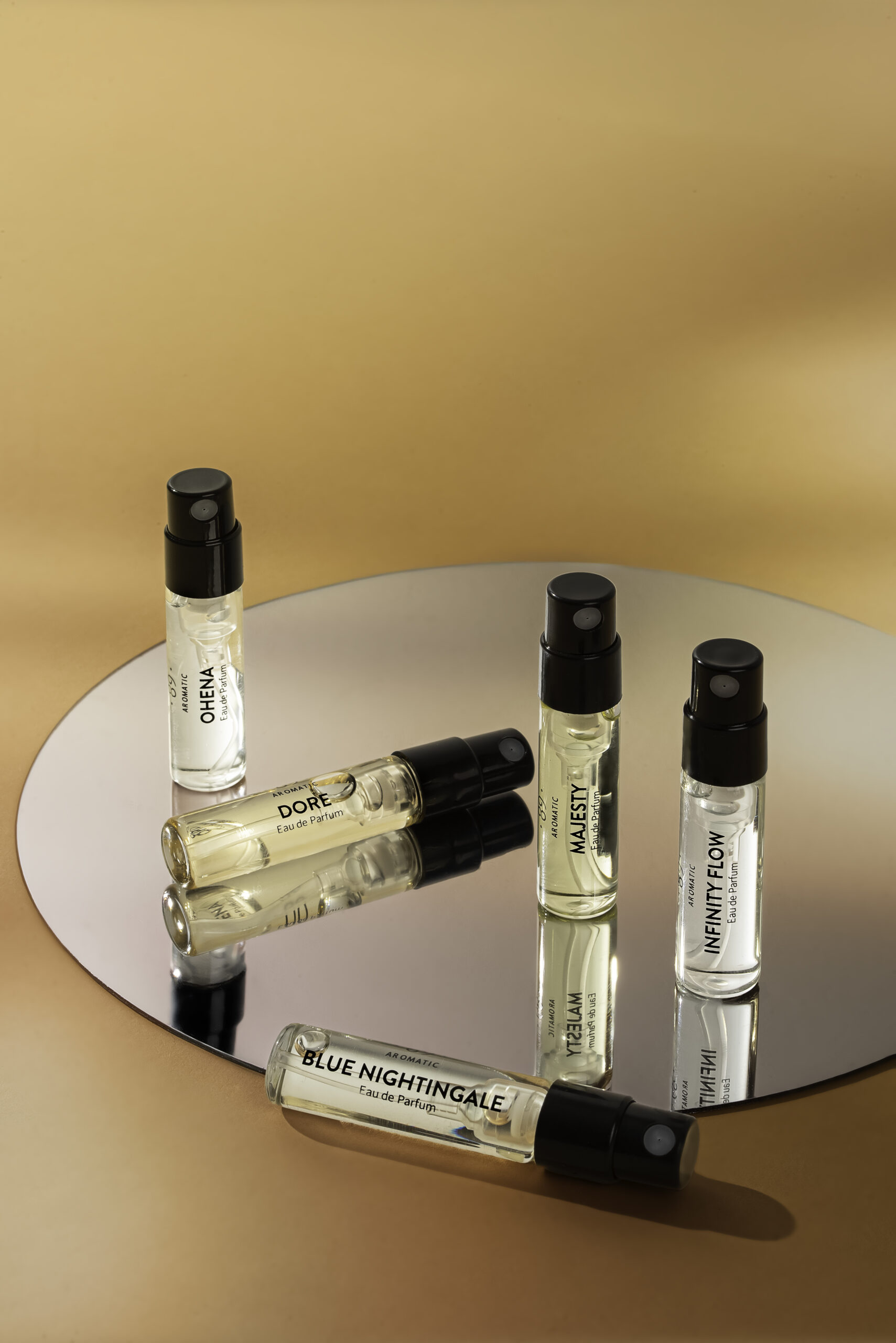 Setet innehåller 5 unisex Eau De Parfum-prover: Blue Nightingale, Dore, Infinity Flow, Majesty, Ohena.